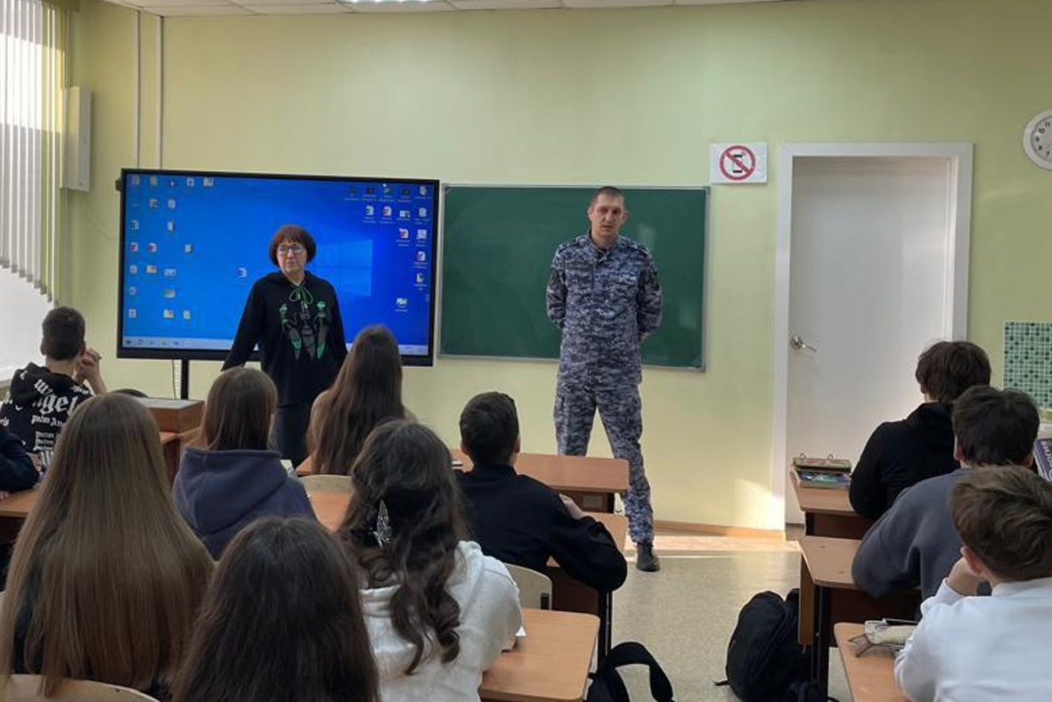 В школе №31 города Осинники для учащихся 8-го класса прошёл «Урок Мужества», на котором выступил сотрудник городского филиала вневедомственной охраны Росгвардии