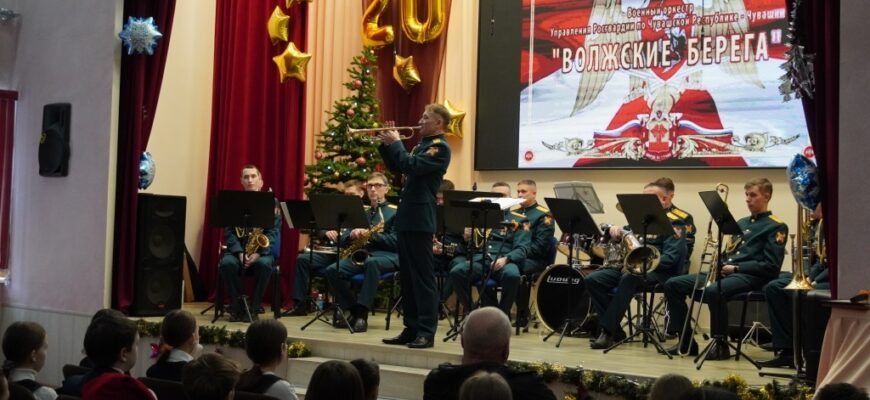 Военный оркестр «Волжские берега» Управления Росгвардии по Чувашской Республике – Чувашии с радостью поздравил школьников Чебоксар с наступающим Новым годом.
