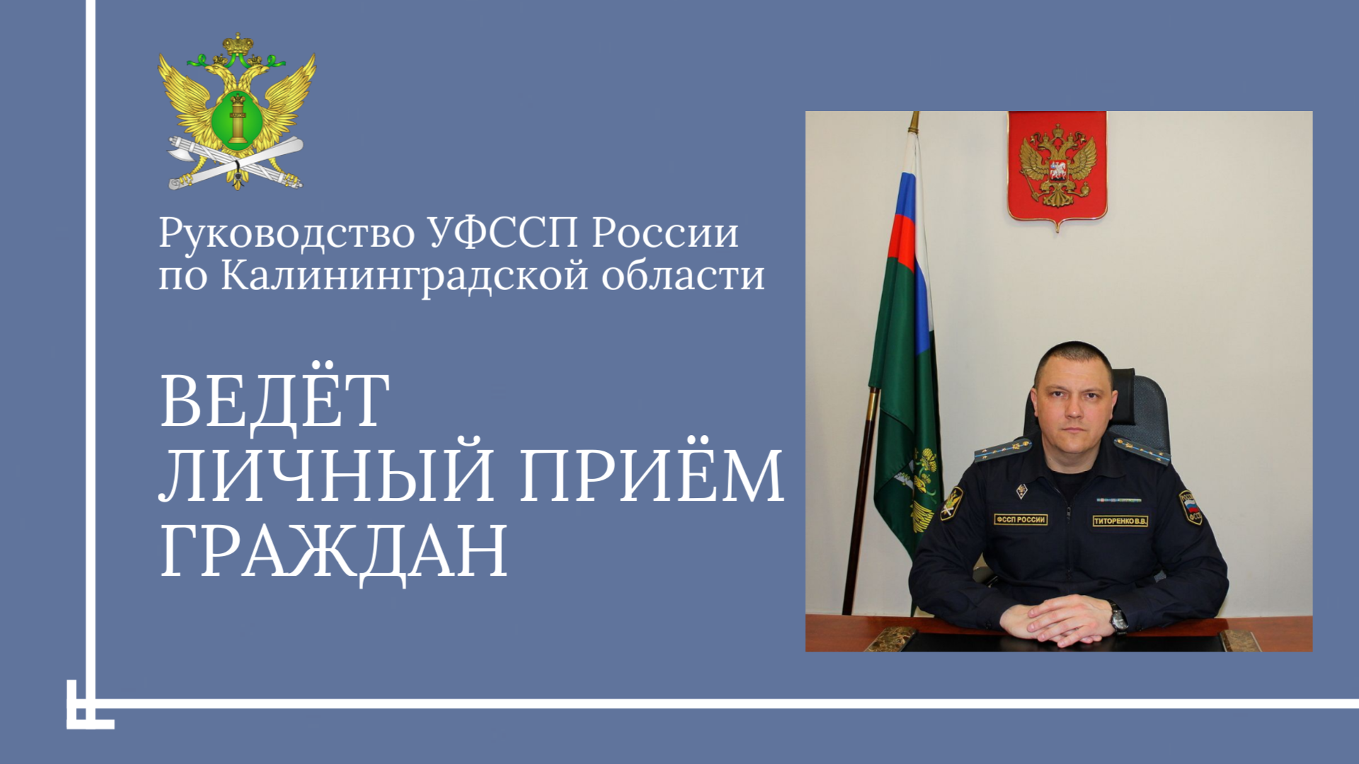 Напоминаем, что руководитель УФССП России по Калининградской области Владимир Васильевич ТИТОРЕНКО и его заместители на постоянной основе ведут личный прием граждан.