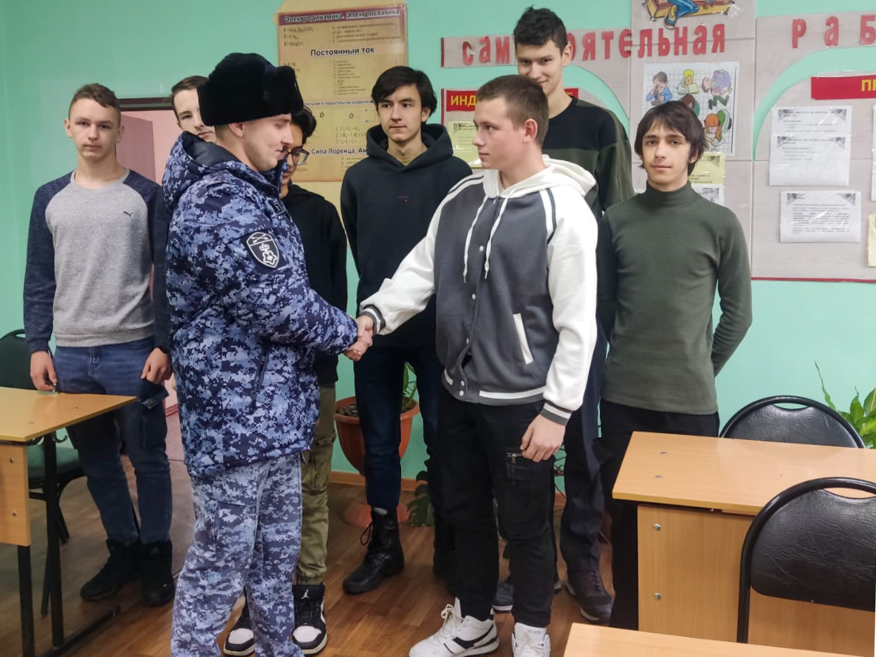В Киселевске представитель городского филиала вневедомственной охраны Росгвардии встретился с первокурсниками политехнического техникума.