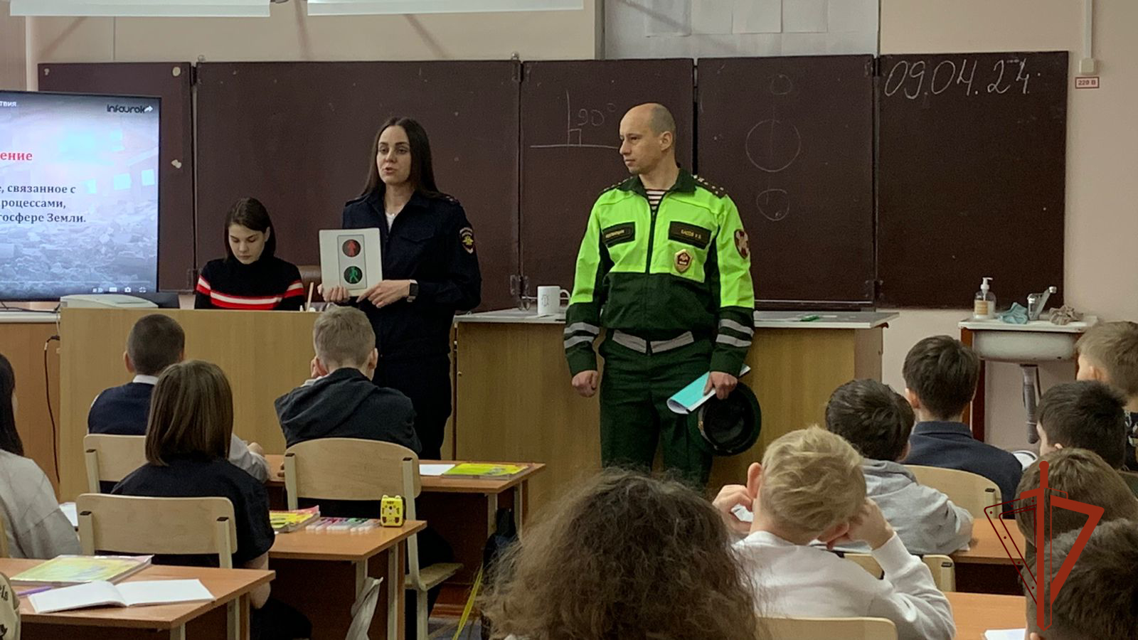 Инспектор ВАИ Управления Росгвардии по Омской области капитан Константин Басов вместе со старшим инспектором по ПБДД омской госавтоинспекции Кристиной
