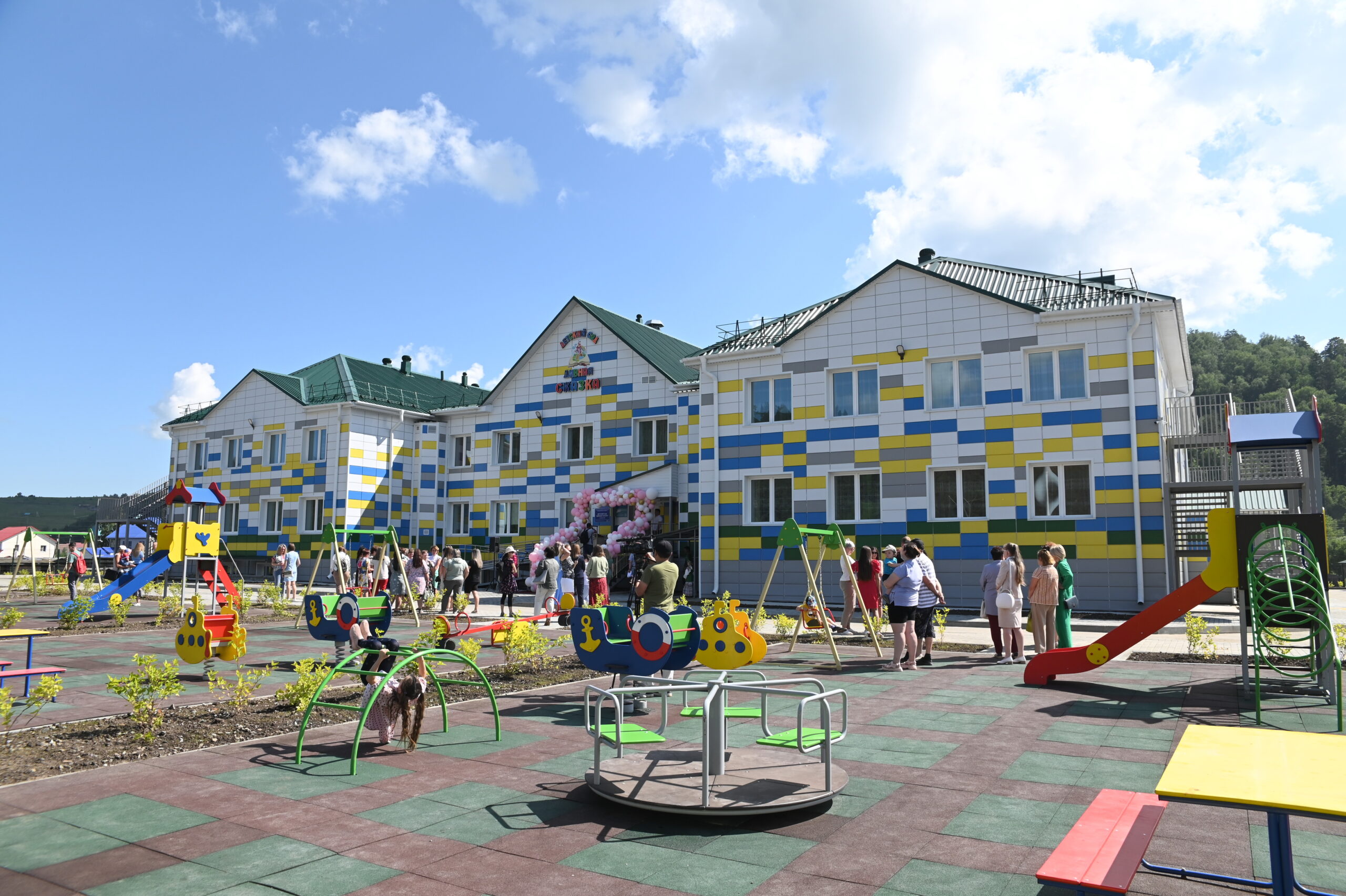 Сегодня, 4 июля 2023 г., в с. Кызыл-Озек Майминского района состоялось торжественное открытие детского сада «Дивная сказка», построенного в рамках национального