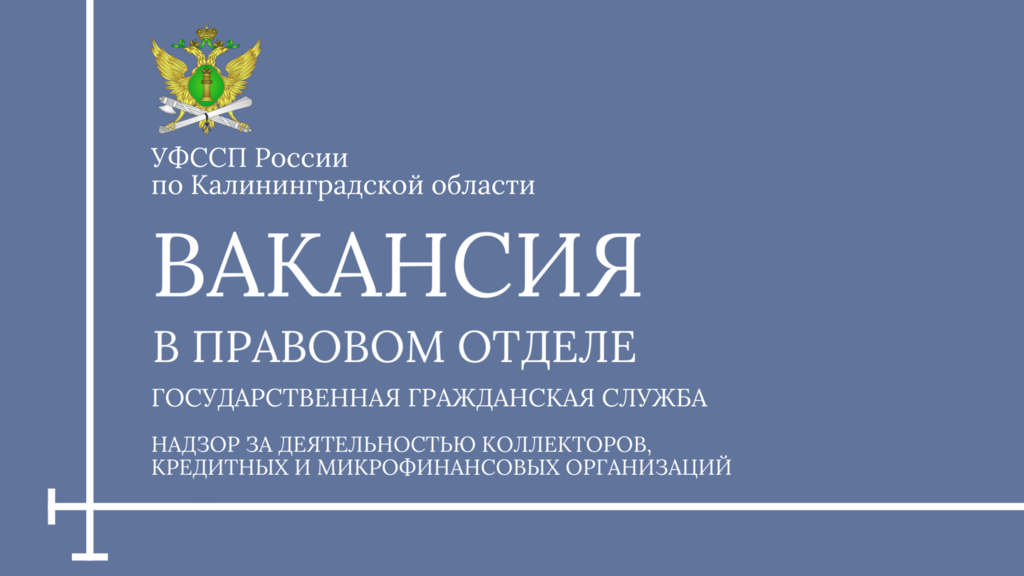 Как стало известно корреспонденту ЗАКОНВЕСТ, вакансия по должности государственной гражданской службы открыта в отделе правового обеспечения, контрольно-надзорной и разрешительной деятельности УФССП России по Калининградской области.