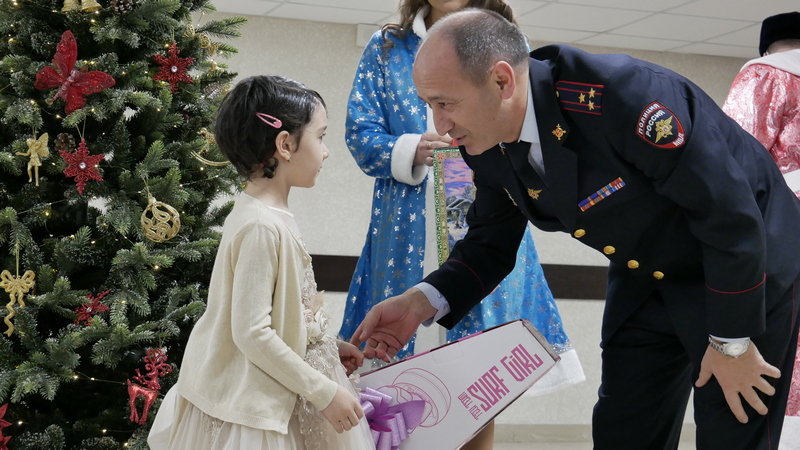 Заместитель министра Сергей Гончаров подарил игровой набор Заре Шереметовой. Элина Коблева получила от заместителя министра Дениса Кнышова инвентарь для занятий художественной гимнастикой. Айла Хапаева была рада косметическому набору для девочки от заместителя министра Солтана Капланова. Пятилетняя Медина Башкаева получила долгожданный самокат от заместителя начальника полиции по охране общественного порядка МВД по КЧР Ануара Шаева. Амирхану Башкаеву скейтборд вручил заместитель начальника полиции МВД по КЧР Георгий Пелихов.