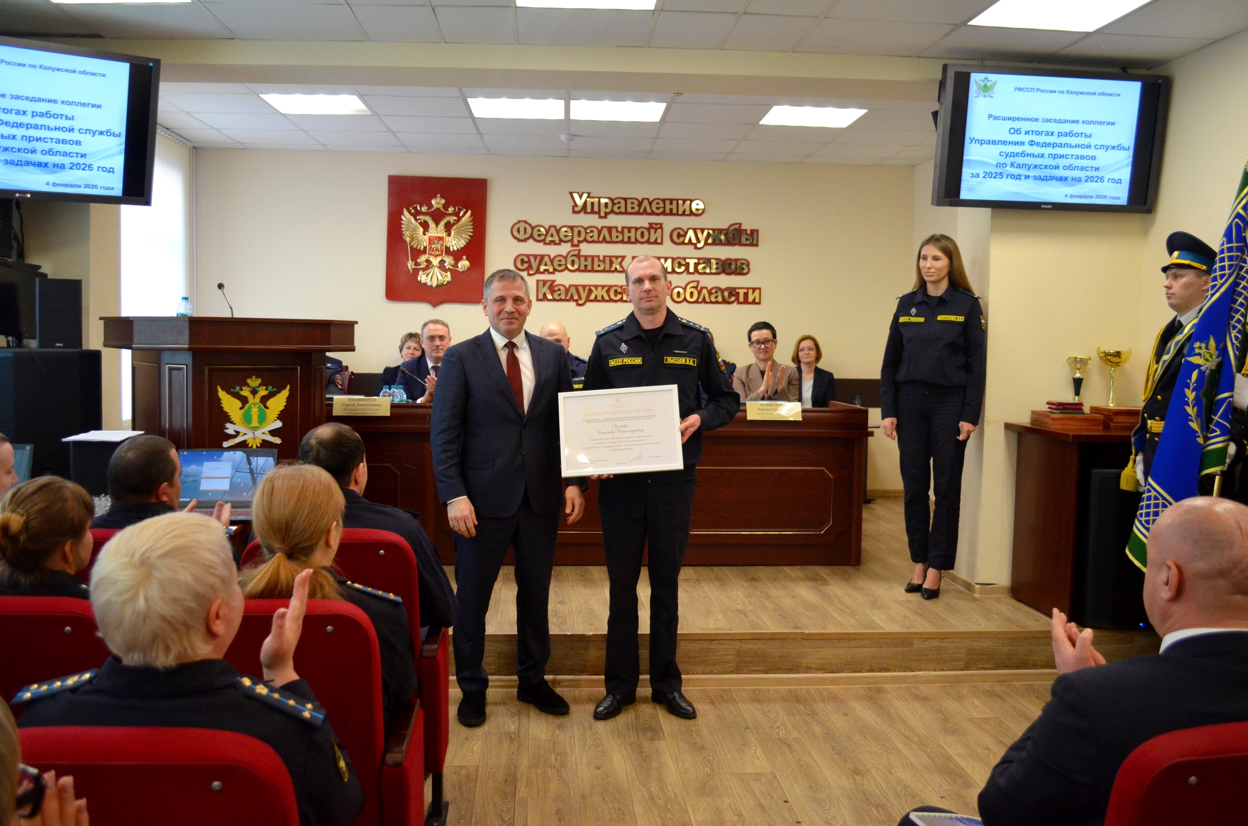 В работе расширенного заседания коллегии Управления Федеральной службы судебных приставов по Калужской области по итогам деятельности за 2025 год принял участие Уполномоченный по правам ребенка в регионе Дмитрий Илюхин. В ходе своего выступления он поблагодарил сотрудников органа принудительного исполнения за работу в рамках своих полномочий по защите законных прав и интересов несовершеннолетних.