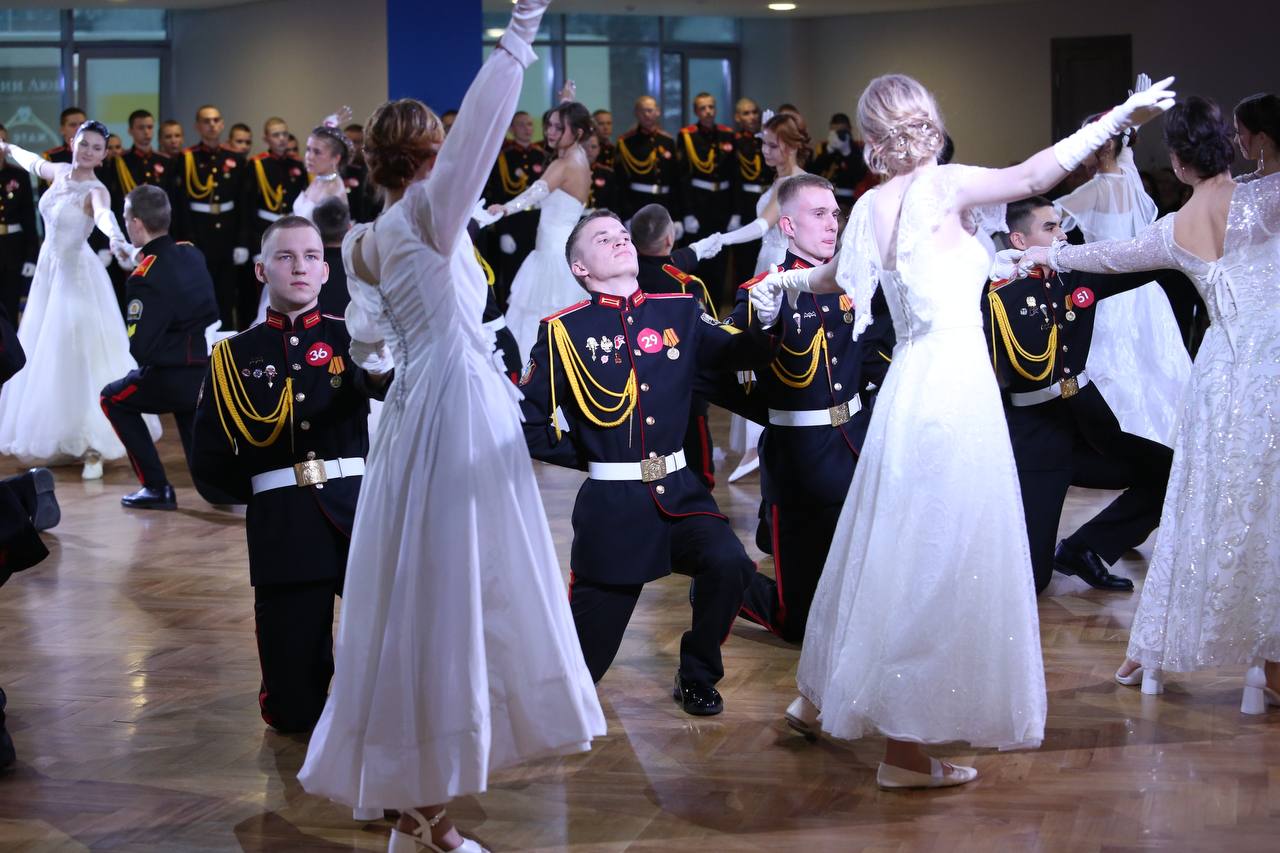 Новогодний бал начался с грациозного и величественного полонеза. Зал, сиявший огнями и улыбками, на мгновение перенес всех в эпоху изящных манер. Подтянутые кадеты в парадной форме вместе со своими спутницами, родителями и педагогами кружились в едином ритме, исполняя традиционные бальные танцы. Среди шестнадцати подготовленных танцев десять вошли в конкурсную программу.