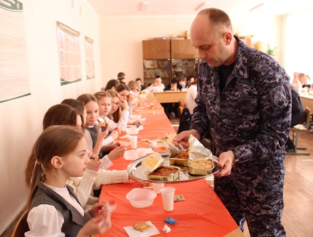 После чего подполковник Дмитрий Осипов и боец ОМОН «Симбир» рассказали детям о составе современного индивидуального рациона питания — сухпайка, рассчитанного на три полноценных приема пищи, в каждый из которых входят консервы, галеты, сладкое и напиток.