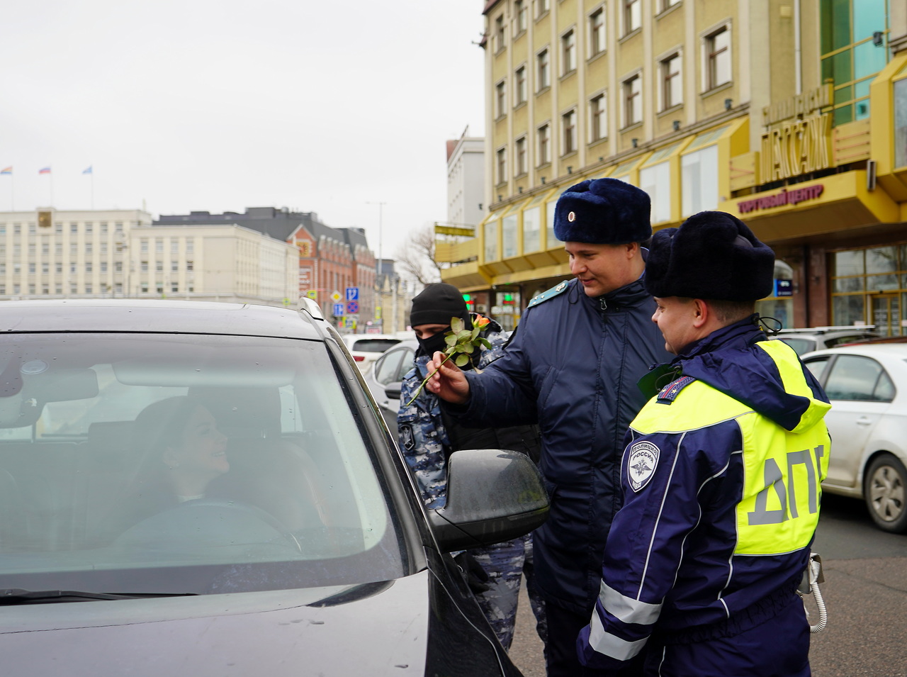 Калининградские приставы и госавтоинспекторы вышли в предпраздничный рейд, чтобы поздравить автолюбительниц с наступающим Международным женским днем.