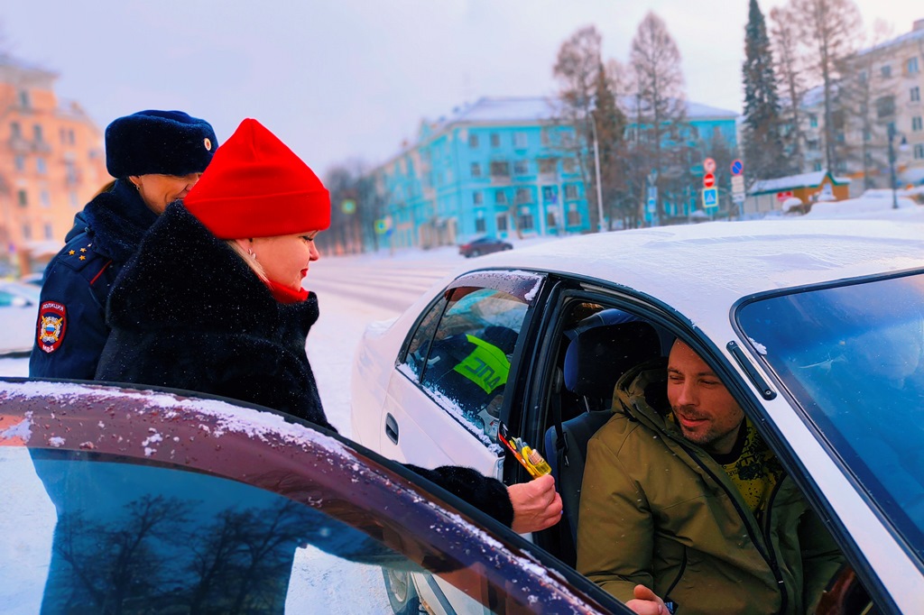 Прапорщик в отставке Алена Руколеева совместно с сотрудниками полиции поздравила мужчин-водителей с наступающим праздником и напомнила о важности соблюдения правил дорожного движения.