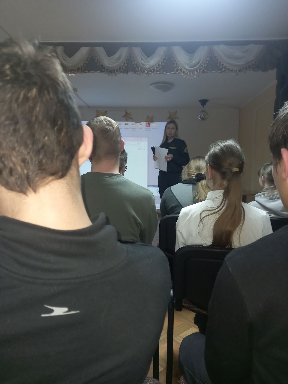 Заместитель начальника отделения судебных приставов города Советска Надежда Худина и судебный пристав-исполнитель Ольга Вилкова поделились информацией об особенностях профессии и показали видеоролик о службе. Присутствовавшие на встрече молодые люди от 16 до 22 лет заинтересовались карьерой в силовой структуре.
