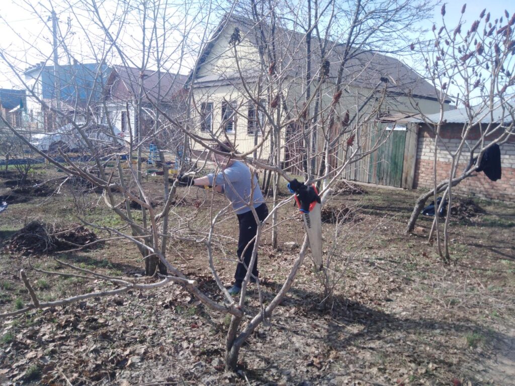Сотрудники помогли убрать придомовую территорию: очистили участок от листьев, обрезали сухостойные ветки на деревьях и кустарниках, собрали мусор и вывезли с территории на свалку. Также по просьбе Агальцевой Л.М. были спилены 2 дерева, кроны которых находились на крыше дома и могли сорвать шифер во время ветра.