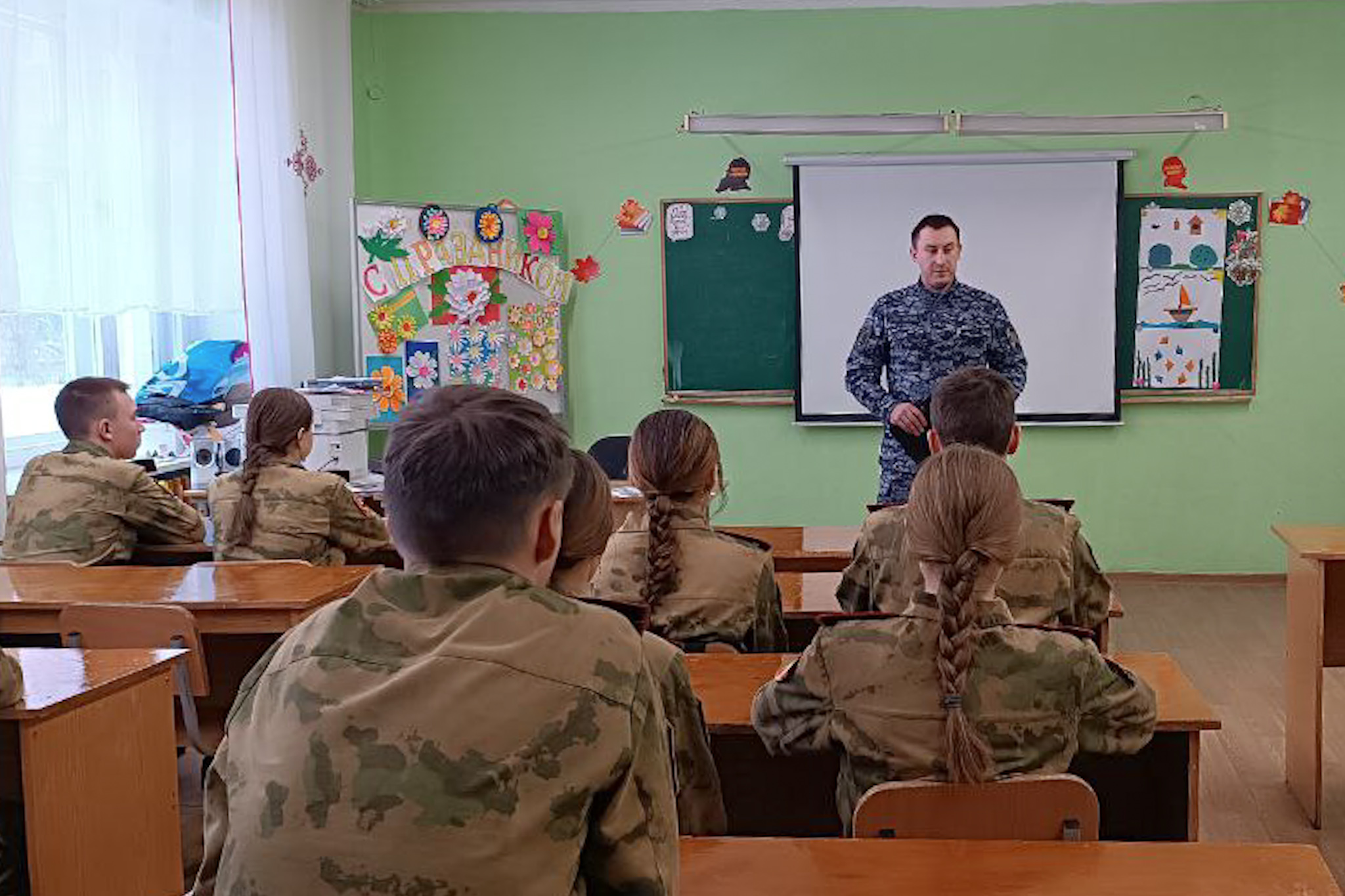 В рамках мероприятий, посвященных Дню защитника Отечества, а также знаменательным датам ведомства: 10-летия образования Федеральной службы войск национальной гвардии Российской Федерации и 215-летия войск правопорядка, сотрудник отдела вневедомственной охраны Управления Росгвардии по Республике Марий Эл встретился с учащимися подшефного класса общеобразовательной школы №15 города Йошкар-Олы.
