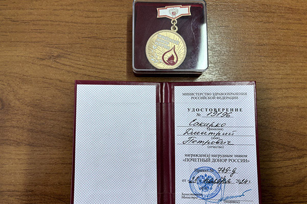 Торжественная церемония вручения нагрудных знаков и удостоверений «Почетный донор России» состоялась в Центре крови №1 г. Минусинска. Их обладателями стали трое жителей города Минусинска, среди которых сотрудник Минусинского межмуниципального филиала УИИ ГУФСИН старший лейтенант внутренней службы Дмитрий Сакирко. Нагрудные знаки донорам вручил заведующий отделением Центра крови Александр Русаков.