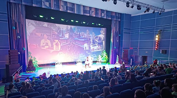 Перед началом показа праздничной театральной постановки юных гостей встретили сказочные персонажи, которые увлекли ребят веселыми конкурсами и хороводом возле новогодней елки. После чего зрители переместились в зал, где для них было развернуто интерактивное представление с участием героев из русских сказок.