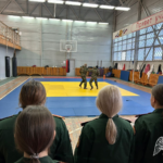 После выставки гостей пригласили в спортзал, где они смогли присоединиться к разминке спецназовцев. Сотрудники Росгвардии продемонстрировали ребятам отработку боевых приемов борьбы и защиты от ударов.