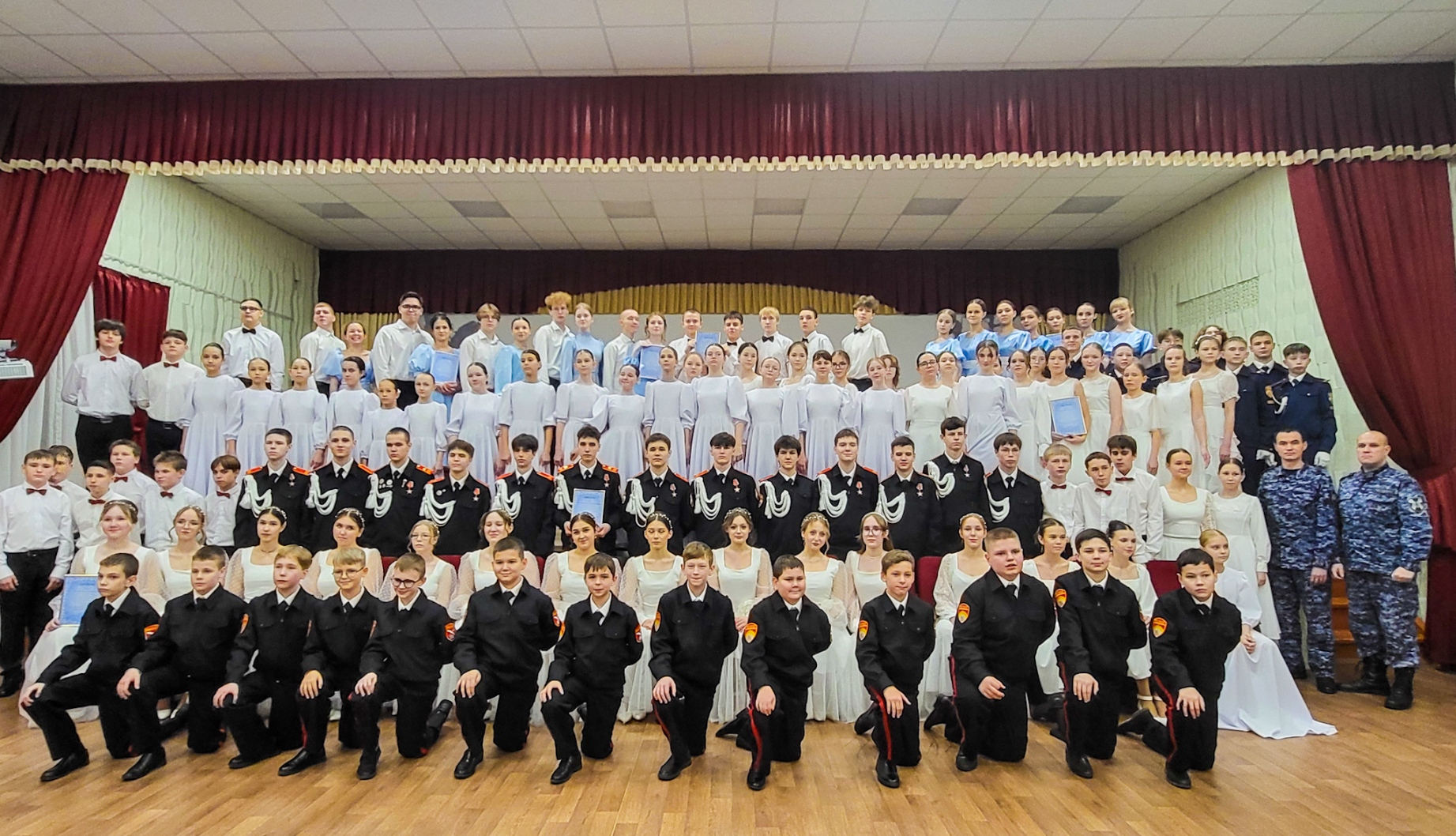 Зал замер в восхищении, когда пары в торжественном ритме открыли бал. Девушки в роскошных платьях и кадеты в строгих костюмах создали неповторимую, праздничную картину. В программе были как классические, так и игровые танцы: оживлённая «полька знакомств», задорная и сложная «кадриль», требующая слаженности всего коллектива, и, безусловно, кульминация вечера – величественный и проникновенный кадетский вальс.