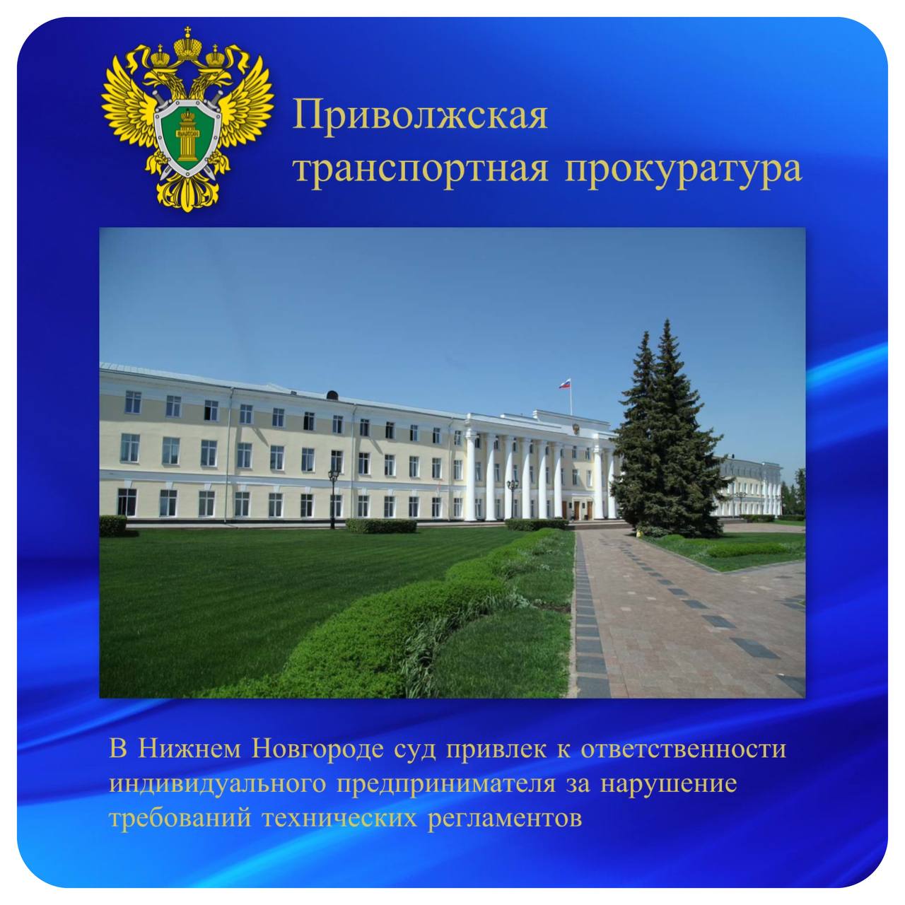 ⚖️Арбитражный суд Нижегородской области по материалам транспортной прокуратуры привлек индивидуального предпринимателя, осуществлявшего реализацию небезопасной продукции, к административной ответственности по ч. 1 ст. 14.43 КоАП РФ (нарушение продавцом требований технических регламентов к продукции) с назначением наказания в виде штрафа в размере 30 тыс. рублей.