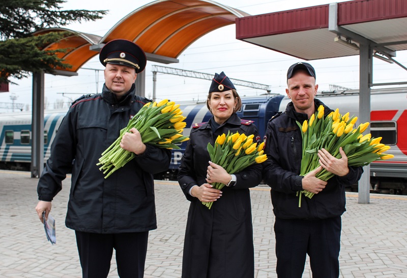 В ходе мероприятия все женщины-пассажиры и сотрудницы вокзального комплекса получили цветы и теплые поздравления от организаторов акции. Наряду с добрыми пожеланиями стражи порядка активно информировали представительниц прекрасного пола о правилах безопасного поведения на объектах железнодорожного транспорта, раздавая специальные памятки с мерами предосторожности.