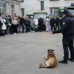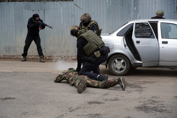 После чего на плацу развернулись динамичные показательные выступления сотрудников СОБР. Бойцы эффектно продемонстрировали момент задержания условных преступников. А инспектор-кинолог ОМОН «Симбир» со служебной собакой по кличке Рэй показали основные элементы послушания и умения четвероногого помощника находить закладки с запрещенными веществами.