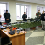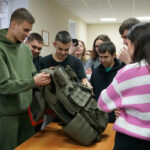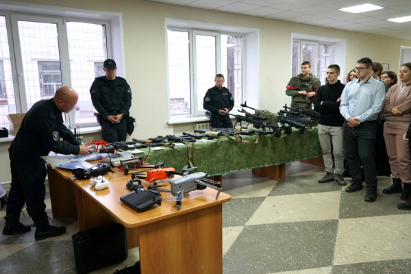 Продолжился урок мужества выставкой учебного оружия и защитной экипировки бойцов, а также демонстрацией работы беспилотного летательного аппарата.