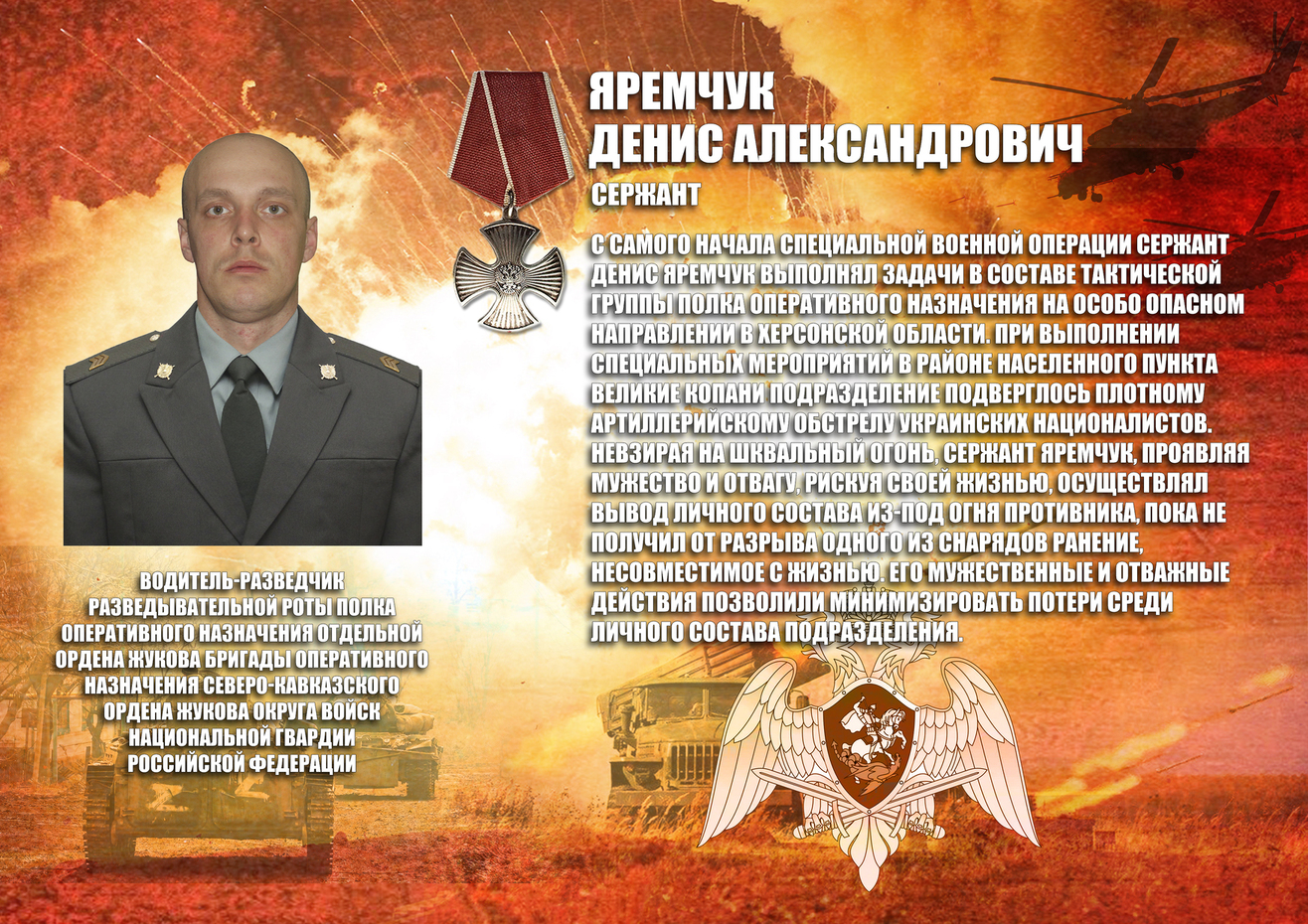 В списки личного состава Урус — Мартановского полка отдельной ордена Жукова бригады оперативного назначения Северо-Кавказского ордена Жукова округа Росгвардии навечно зачислен водитель-разведчик разведывательной роты сержант Денис Яремчук, героически погибший при исполнении воинского долга в ходе специальной военной операции.