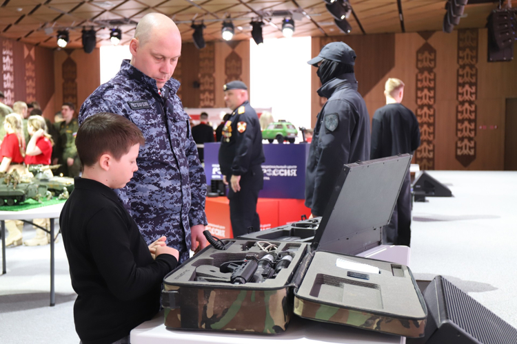 В зале «Обь» Национального центра «Россия» для посетителей центра был развернут агитационный пункт по оказанию содействия гражданам в поступлении в ВУЗы и на службу в подразделения войск национальной гвардии, а также организована выставка образцов вооружения спецподразделений Росгвардии и 3D-моделей «Работайте, братья», подготовленных сотрудником ОМОН «Стерх» и включающих порядка десяти единиц военной техники, выполненной с использованием 3D-печати.