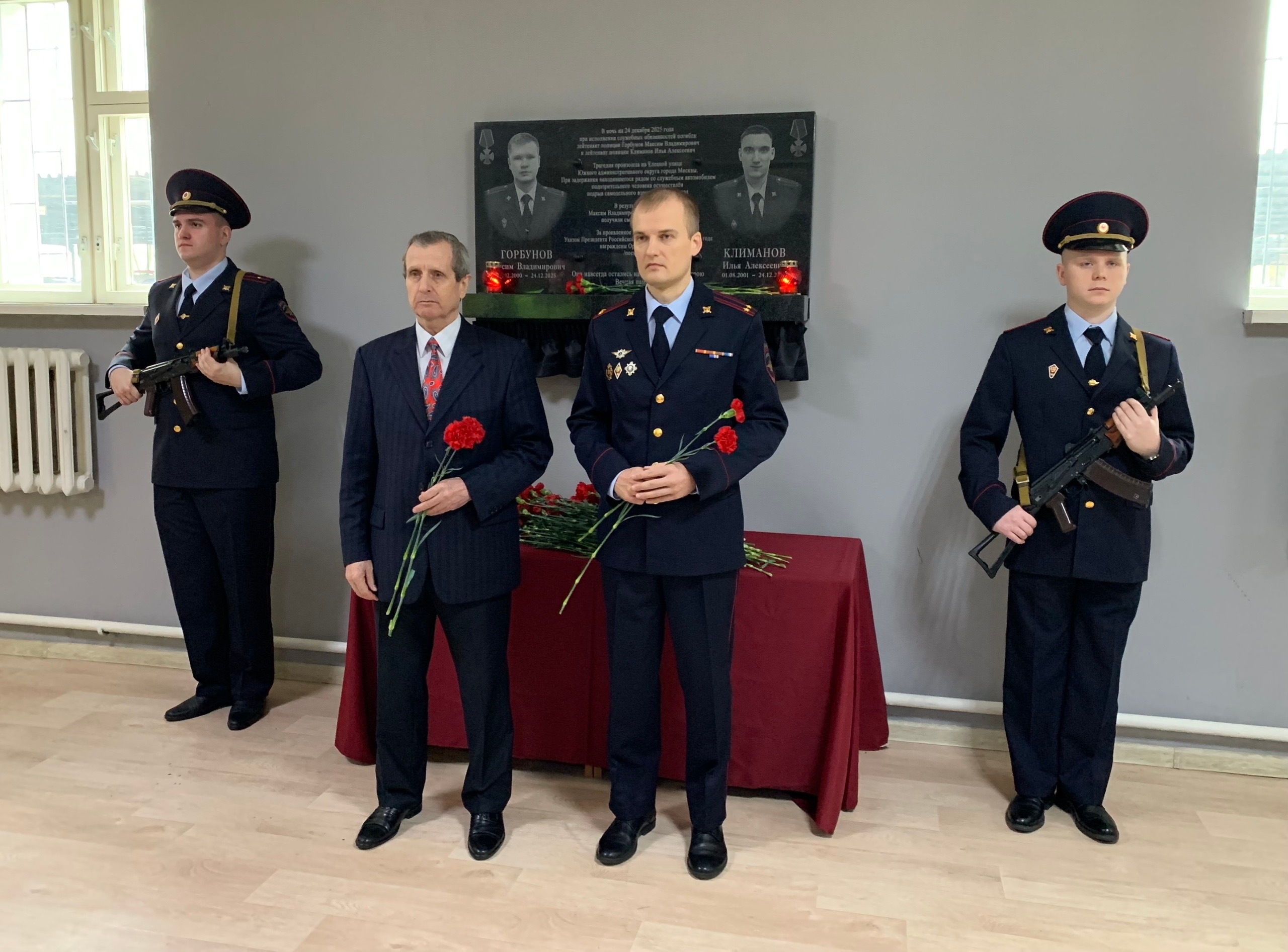 В здании ГИБДД Управления внутренних дел по Южному административному округу ГУ МВД России по г. Москве состоялась торжественная церемония открытия мемориальной доски, посвященной лейтенанту полиции Горбунову Максиму Владимировичу и лейтенанту полиции Климанову Илье Алексеевичу, погибшим при исполнении служебных обязанностей.