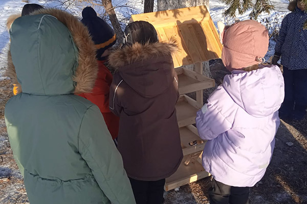 В рамках Всероссийской акции «Покормите птиц зимой» неравнодушные взрослые соорудили многоуровневую кормушку для птиц и вместе с малышами разместили ее на территории маганской школы.